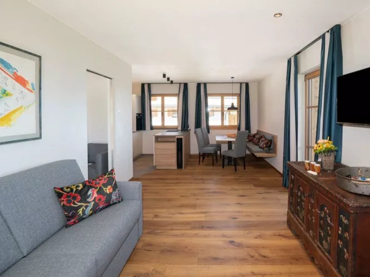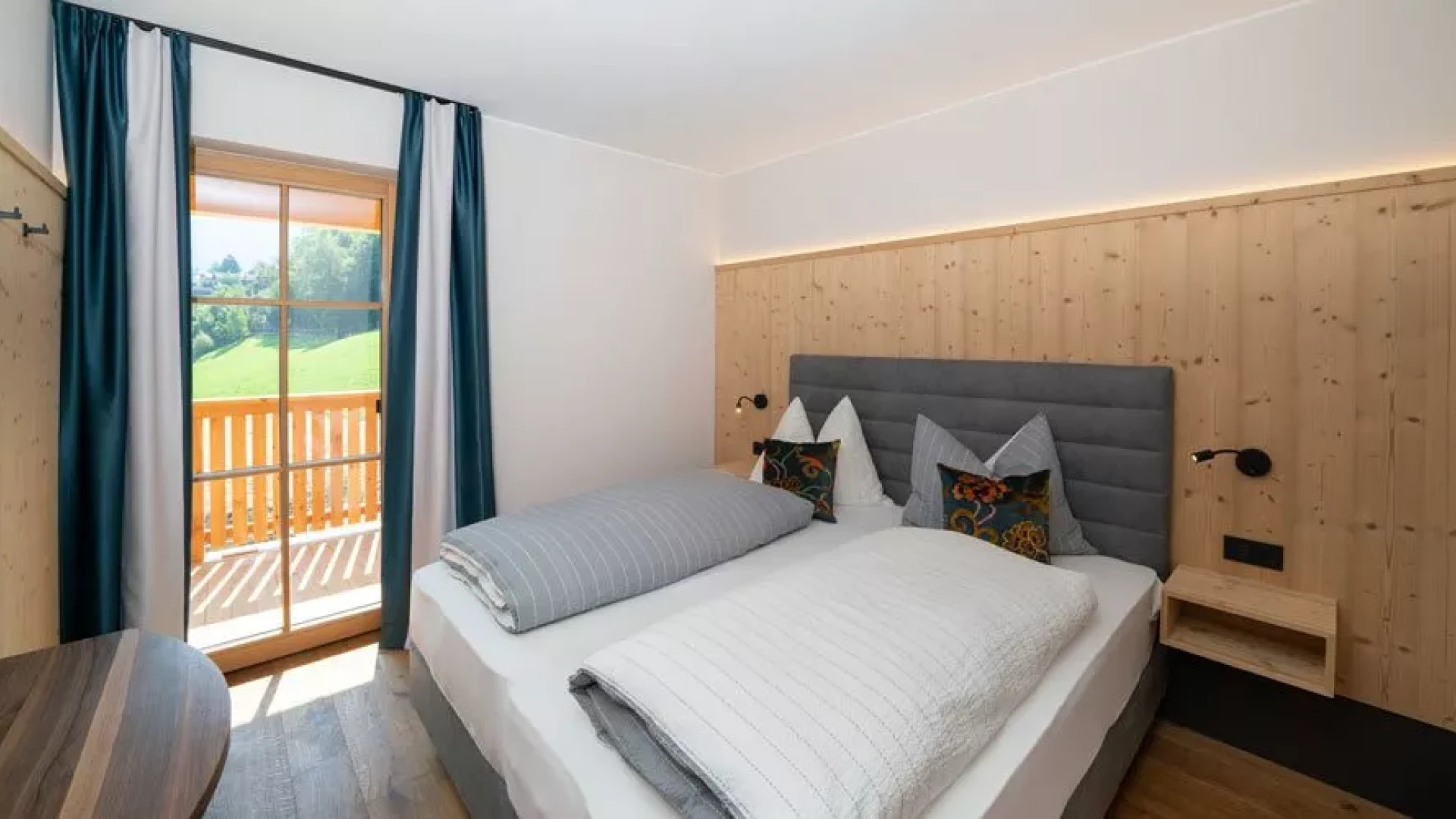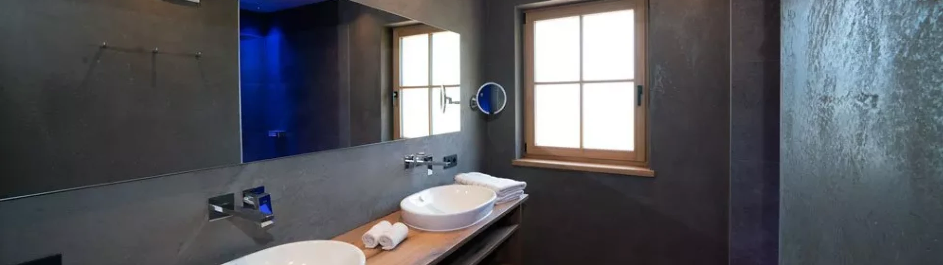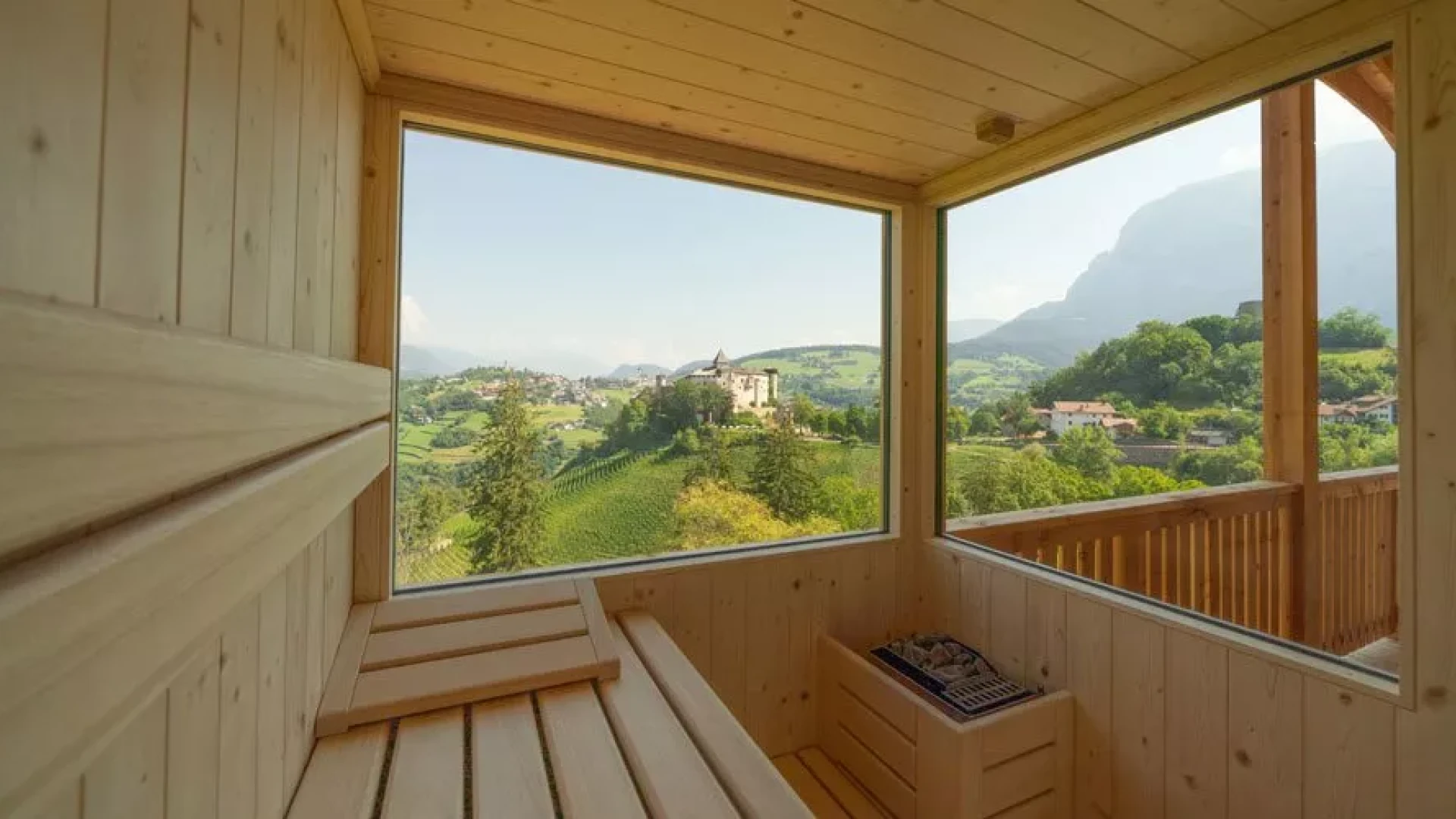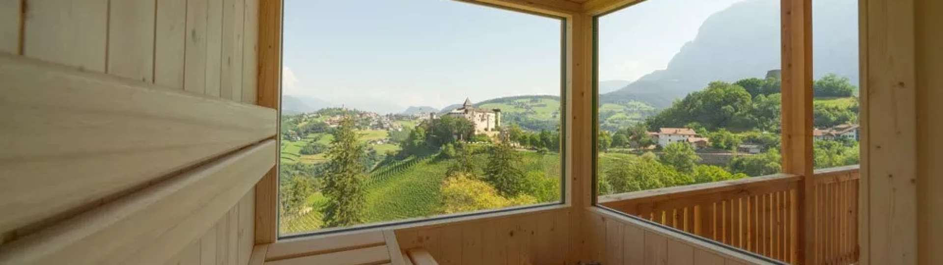 The door is heavy in the hand: larch. The floor behind it: Rock. Wood and stone in the bedroom on the left and in the bathroom on the right. Here there is a rock grotto with a rain shower and blue lighting. The flooring changes from stone to wood, with another bedroom to the right and the panoramic room with kitchen-living room straight ahead. The furnishings are functional and elegant. And when you step out onto the XXL balcony, you have a fantastic view of the Eisack Valley, Völs, Prösels Castle and the Schlern. The view can also be enjoyed from the sauna, which is also located on the balcony. Nothing stands in the way of a heavenly vacation!