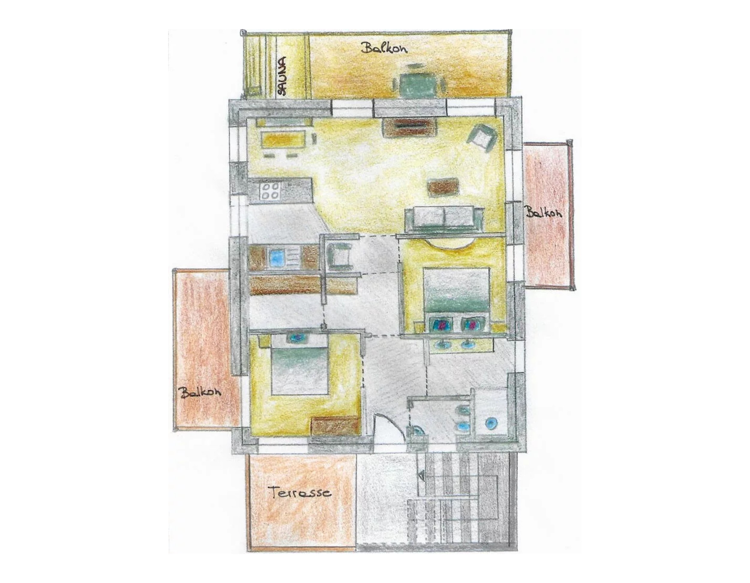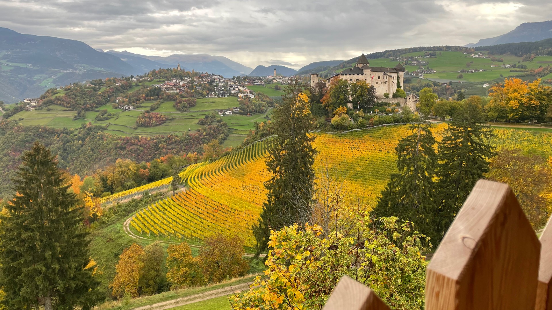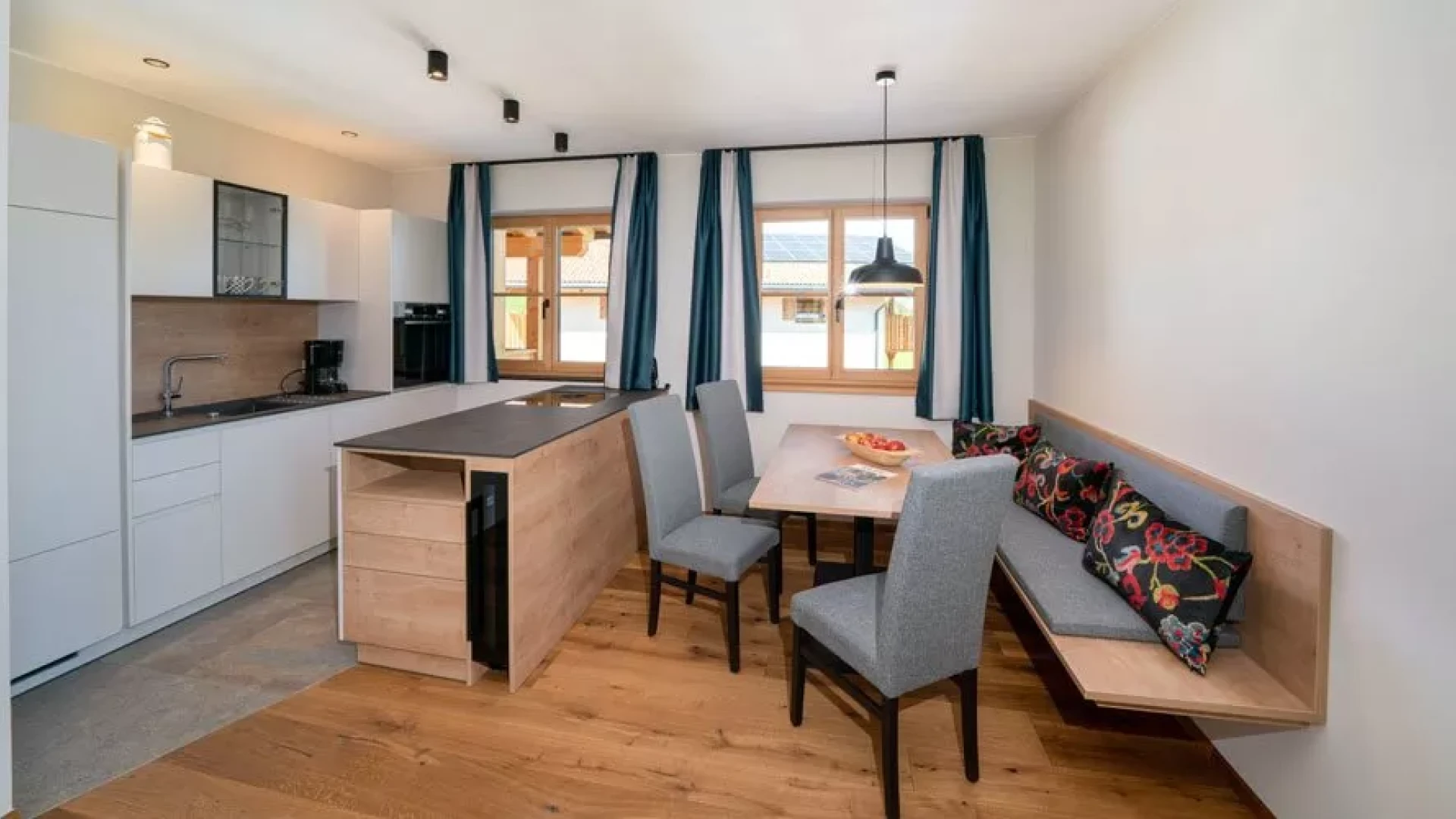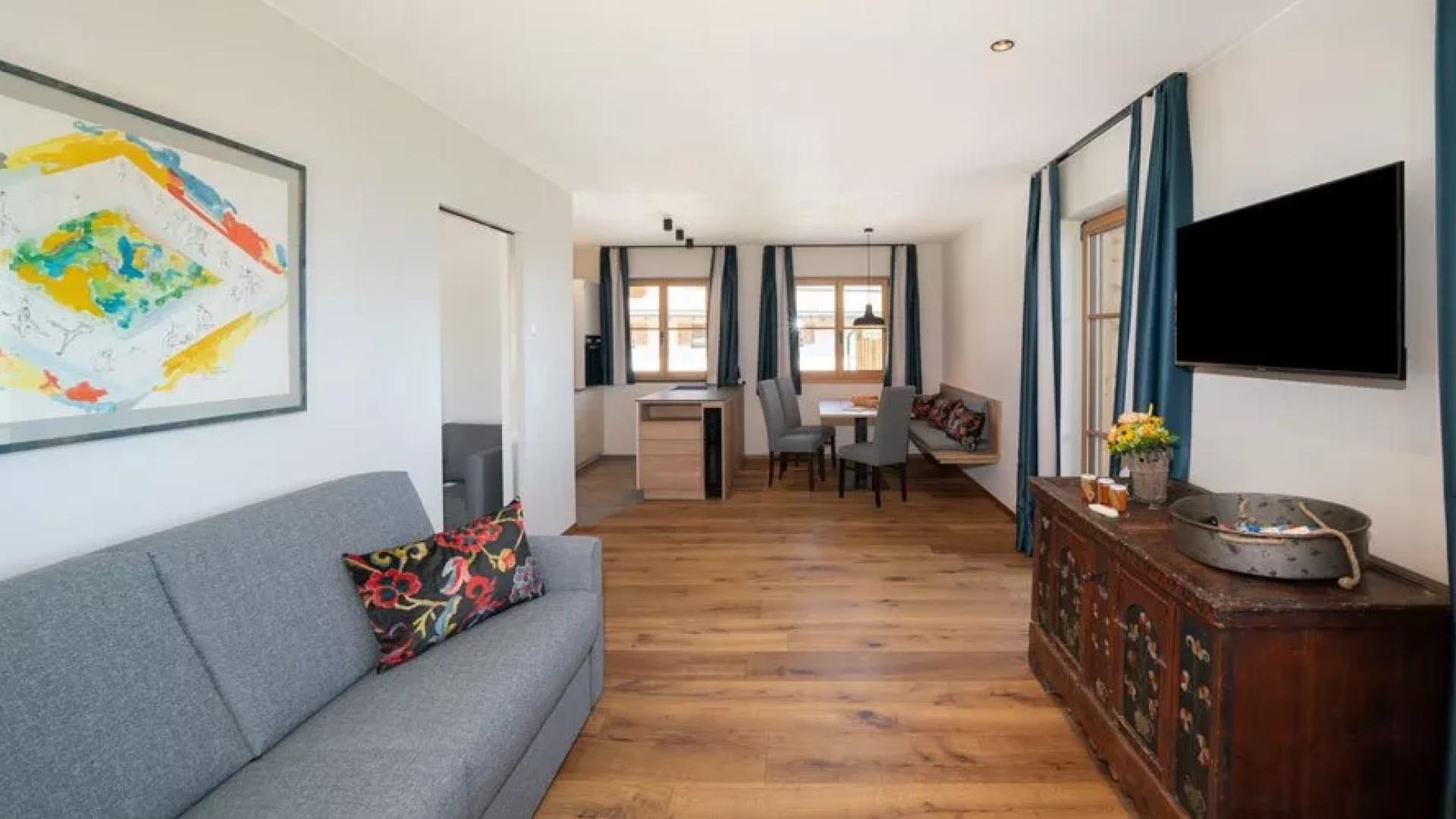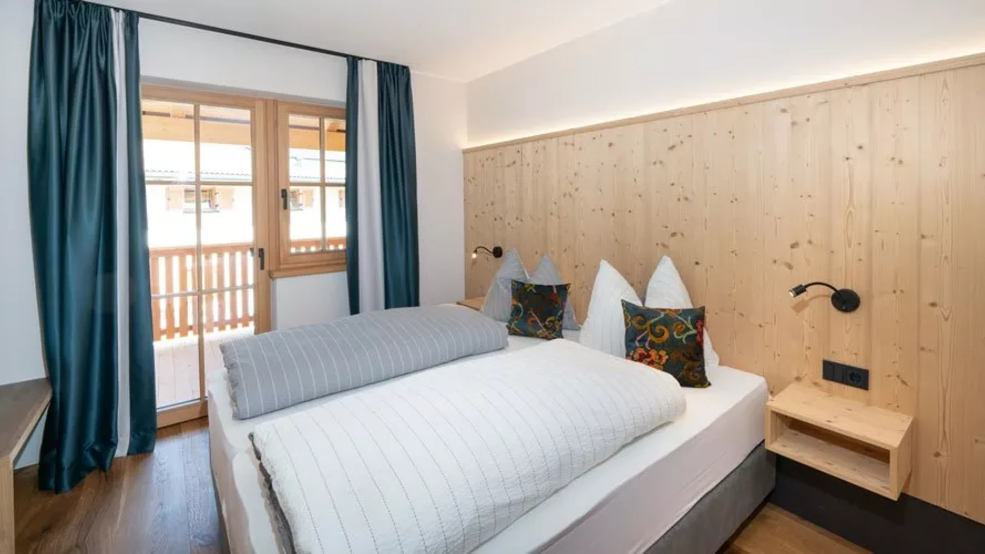 The door is heavy in the hand: larch. The floor behind it: Rock. Wood and stone in the bedroom on the left and in the bathroom on the right. Here there is a rock grotto with a rain shower and blue lighting. The flooring changes from stone to wood, with another bedroom to the right and the panoramic room with kitchen-living room straight ahead. The furnishings are functional and elegant. And when you step out onto the XXL balcony, you have a fantastic view of the Eisack Valley, Völs, Prösels Castle and the Schlern. The view can also be enjoyed from the sauna, which is also located on the balcony. Nothing stands in the way of a heavenly vacation!