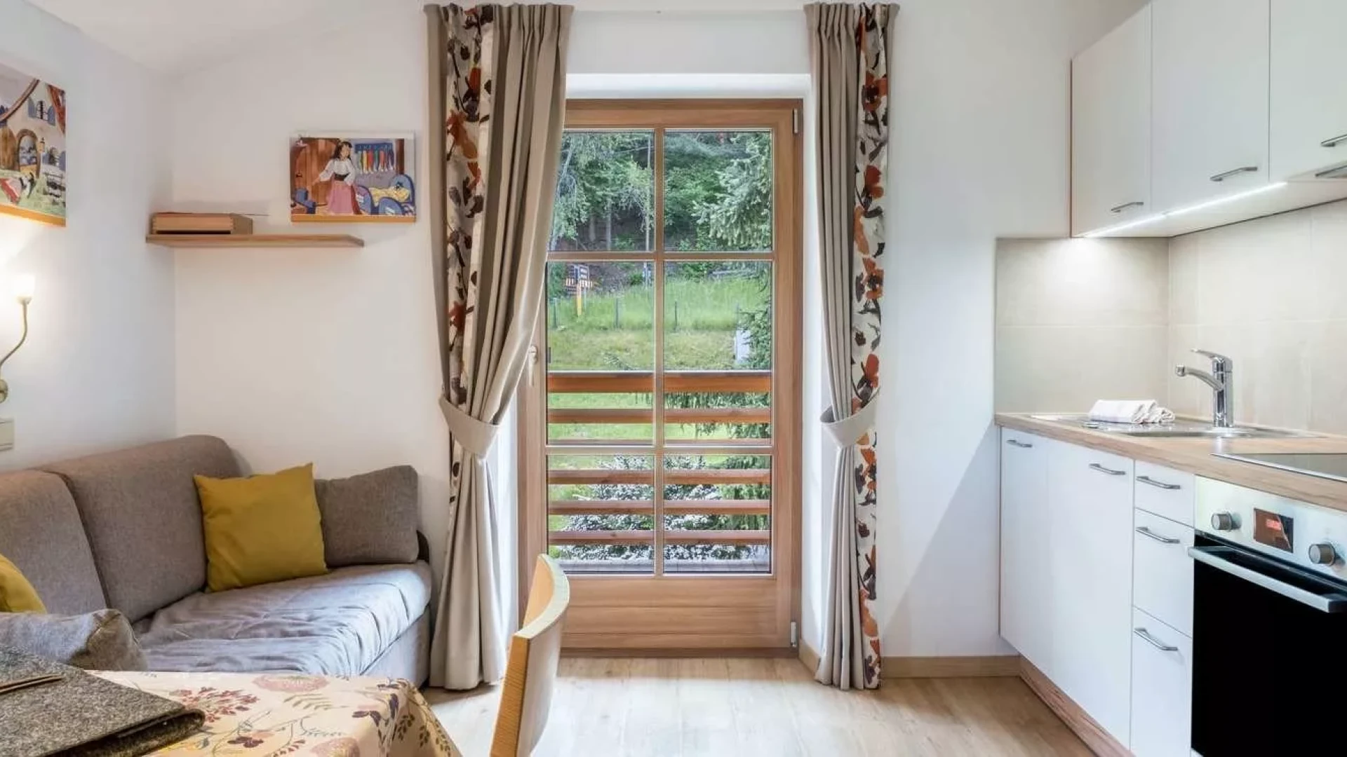Cucina abitabile completamente attrezzata: piano cottura elettrico, forno, lavastoviglie, frigorifero con congelatore, macchina da caffè con filtro, bollitore e divano letto matrimoniale